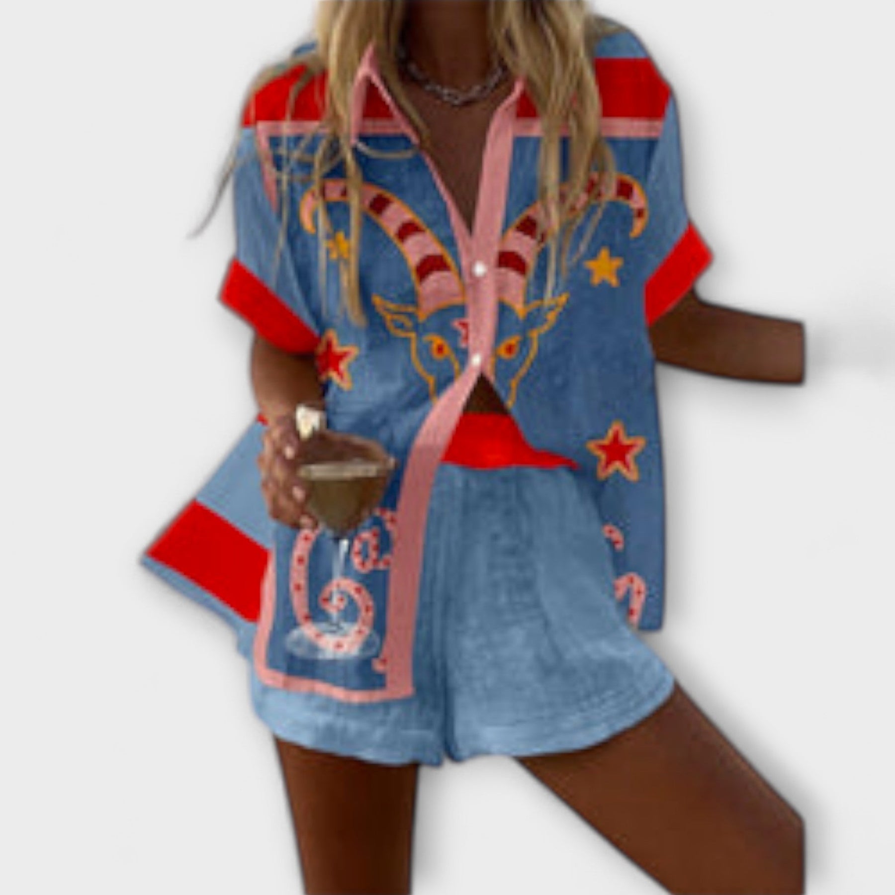 Embrace the spirit of summer with the Jorelle outfit. This vibrant two-piece set features a lively goat pattern and is crafted from lightweight fabric, adding a fun twist to your wardrobe. Perfect for market trips or leisurely afternoons outdoors, Jorelle brings a refreshing energy to your style.