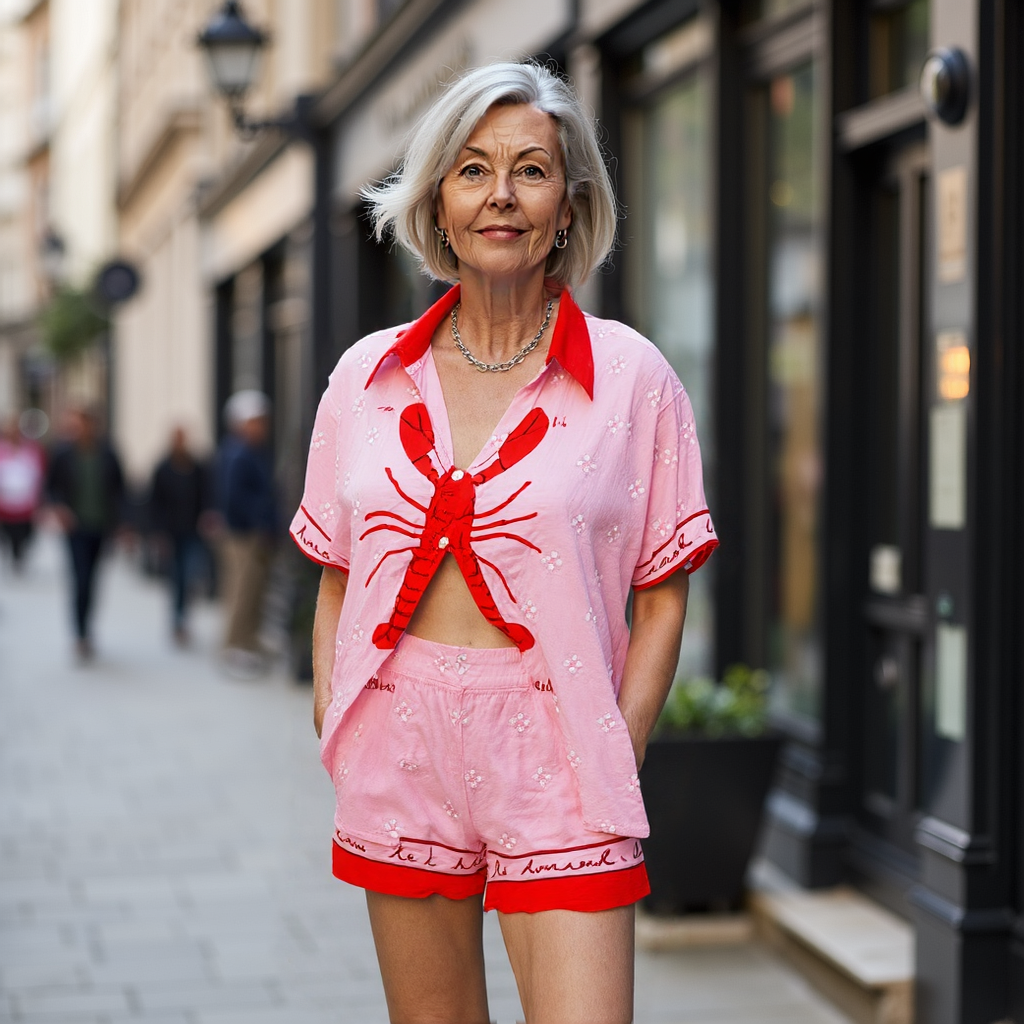 Elevate your summer wardrobe with the Pallina Set, featuring a delightful pink lobster print on airy fabric. Ideal for sunny vacations, beach strolls, or relaxed city afternoons, this set perfectly blends color and comfort.